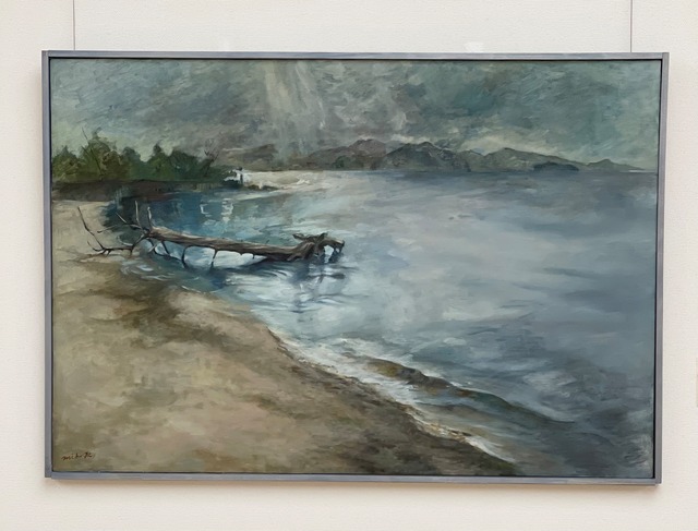 彦根市、松原の浜辺に打ち上げられた流木の風景を描いた作品です。無風の琵琶湖が、とても穏やかな表情で、なんとも言えない静かな気持ちになりました。それを表現しようと思いました。 仮額で良ければ無料でお付けいたいます。